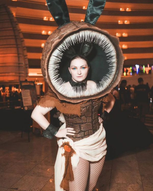 Plant a thumper and summon Jera, a professional cosplayer and costumemaker in Nashville. For the 2023 Dragon Con, she appeared in this costume that mashes up the sandworm from the Dune franchise (specifically the 2020s depictions) and a bunny girl outfit.